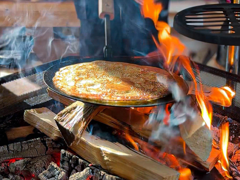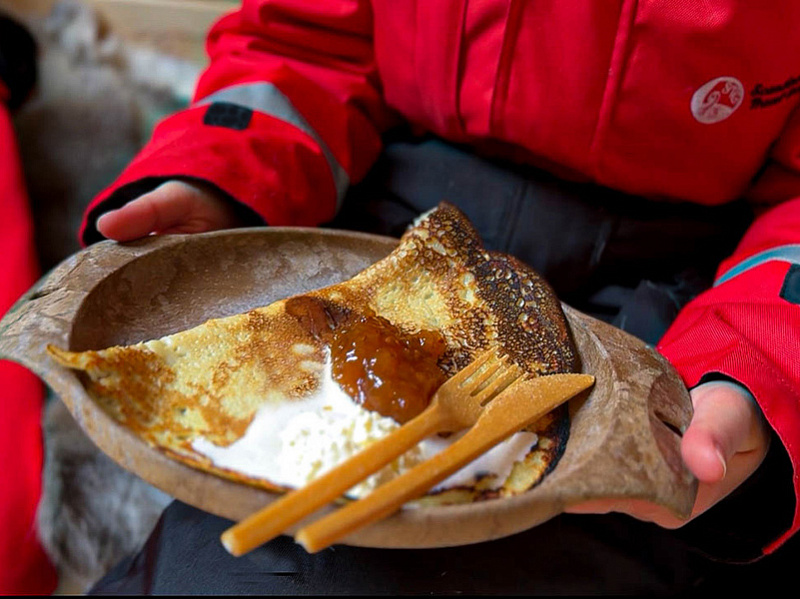 - Campfire lunch at a private wilderness kota: grilled sausage, Finnish pancakes with arctic berry jam, hot drink