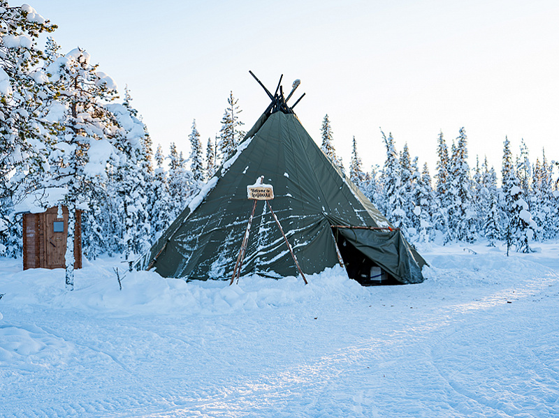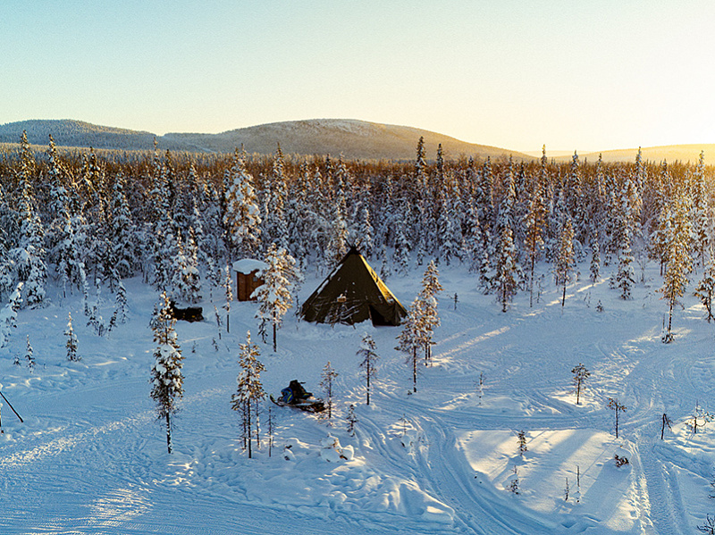 This afternoon snowmobile safari in Levi includes a campfire lunch at a private wilderness kota: