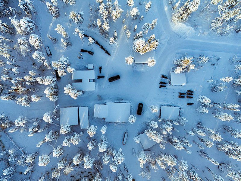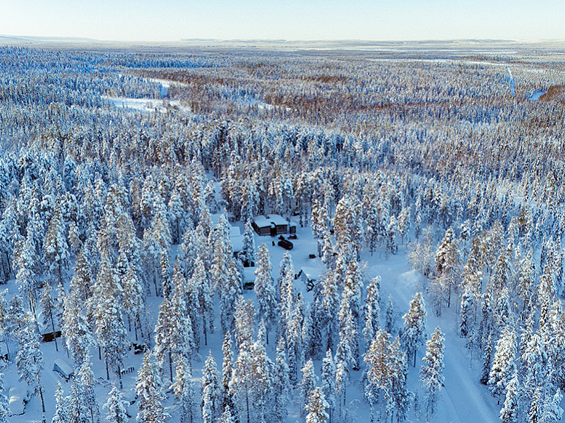 The safari house is in a private forest clearing just minutes from Levi — secluded, quiet, already a step away from the resort. The route follows a mix of public marked snowmobile trails and sections of privately owned land that only STG guests can access. The public trails carry the group efficiently through the landscape; the private sections leave the crowds behind entirely. Average speed when a sleigh is in use: 20–25 km/h. Without a sleigh: 30–45 km/h.