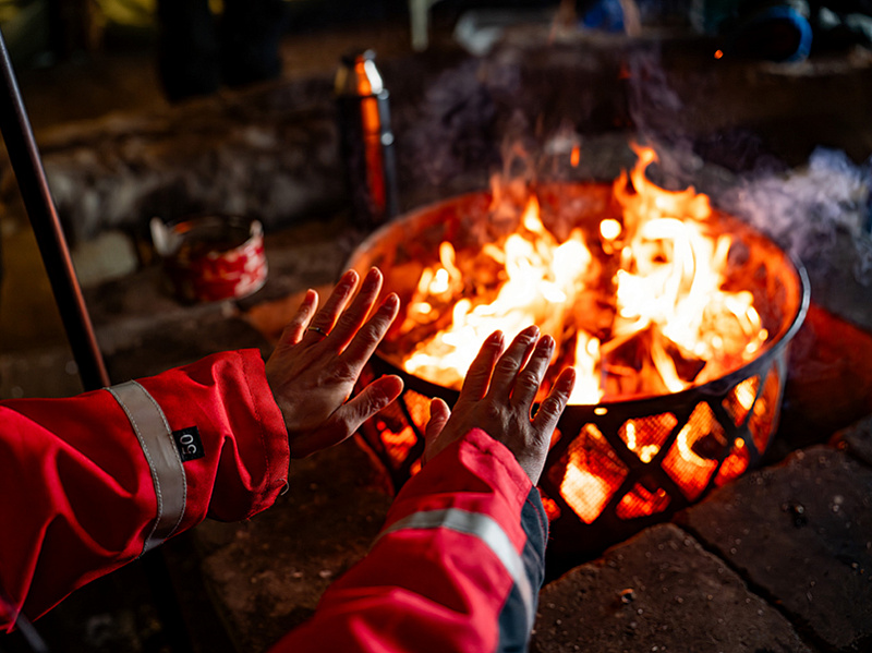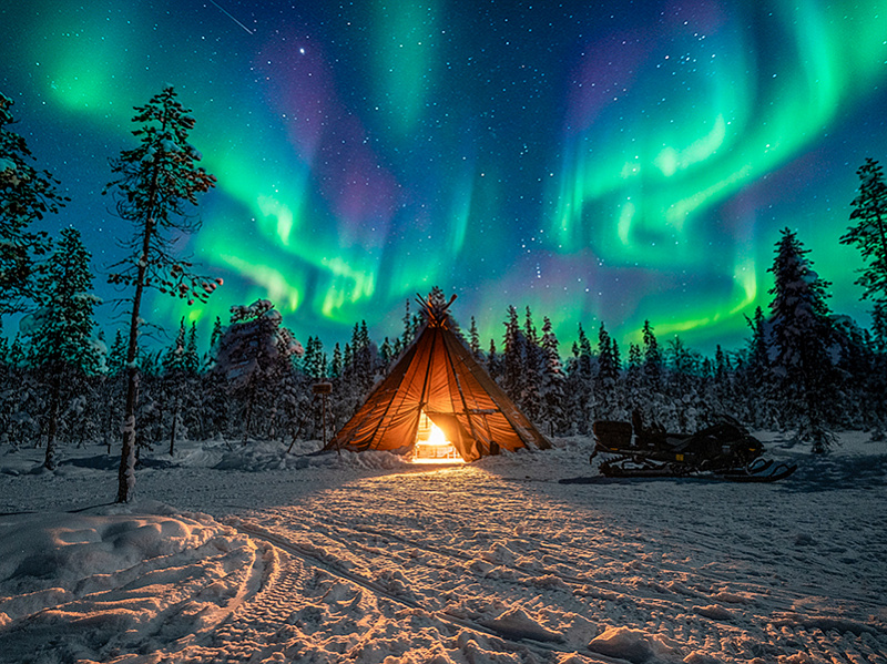 Halfway through, the engines cut out. The kota sits on a vast frozen swamp, far from roads, far from village lights. The sky here is 360 degrees and unobstructed, with the northern horizon open. The kota is prepared and warmed in advance — the fire is ready when the group arrives. Guests grill sausage, pour hot drinks, and look up. The northern lights cannot be promised — they depend on solar activity and a clear night — but the position is among the best in the Levi area for seeing them when they come. After the stop, the second half of the ride back through the dark forest.