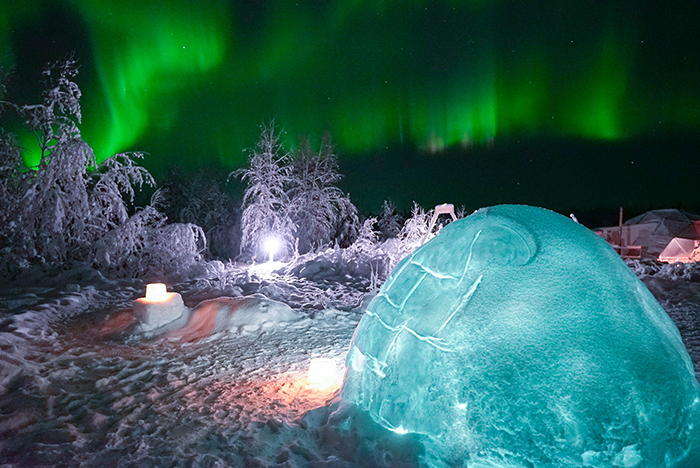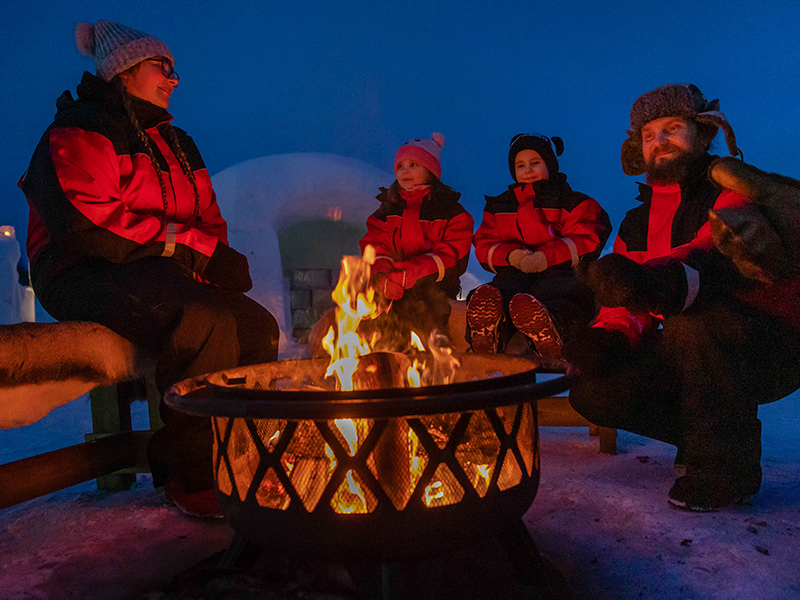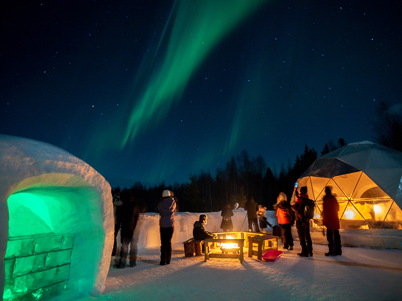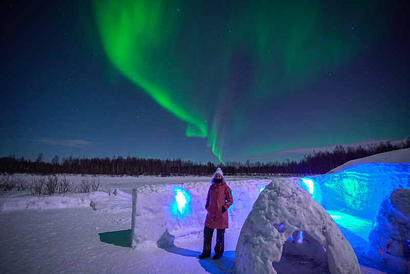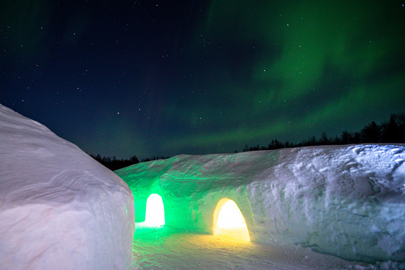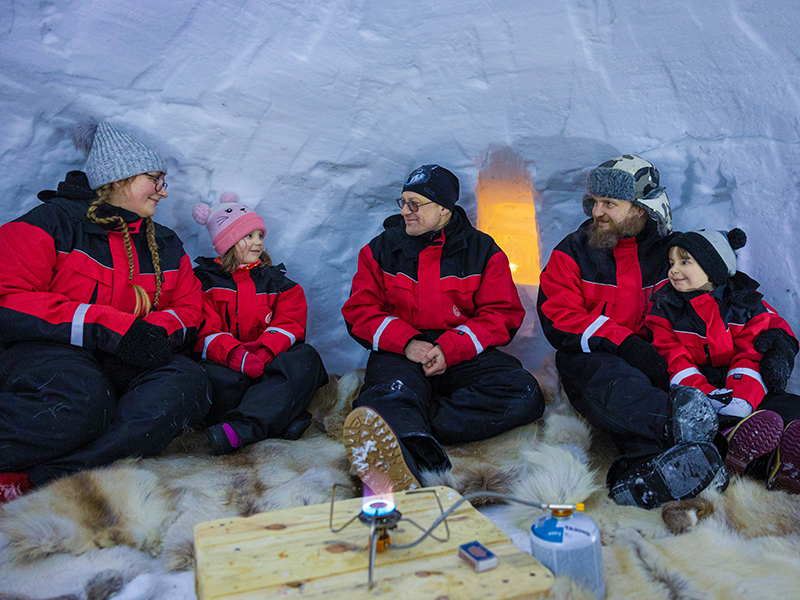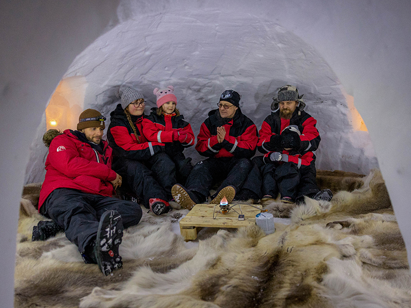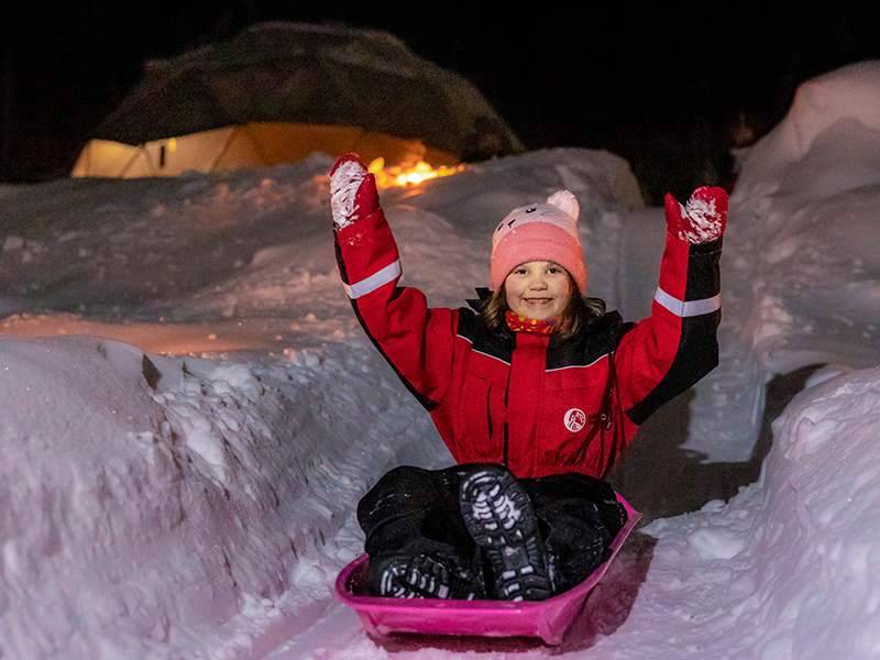It's time to check out our unique Snow Igloo Park. It’s located side by side with Polarman’s camp. We start to build the Snow Park as soon as constant freezing temperatures settle, usually in November. By December we usually manage to build most of the snow park constructions, however, the building process continues in December as well. The whole park is surrounded by walls made of snow and ice. The heart of the park is the big Snow Igloo, the other snow constructions are Inuit snow igloo, snow slide for children, snow maze and of course snowman. The snow walls and other buildings are nicely illuminated and look truly amazing in the darkness. Our Polarman will invite you into the big snow igloo to take part in the winter survival course. For children we have a snow playground with tobogganing on the snowslide, snow maze and tunnels. As the winter season goes by, the Snow Park grows bigger thanks to our unique “Build Your Own Snow Igloo” program. You can check the Igloos built by other guests on a 3-hour masterclass program.