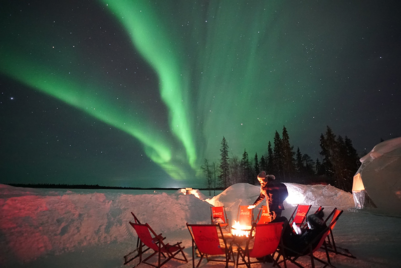 Polarman will then invite you inside our warm Aurora dome. The temperature inside stays +15 degrees or higher. You can sit comfortably and watch our blazing fireplace, while we serve you warm drinks and cookies.