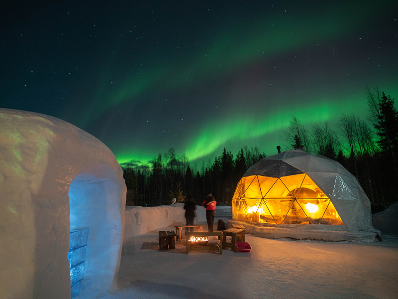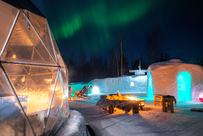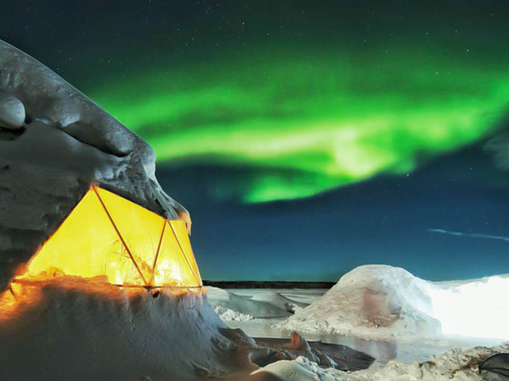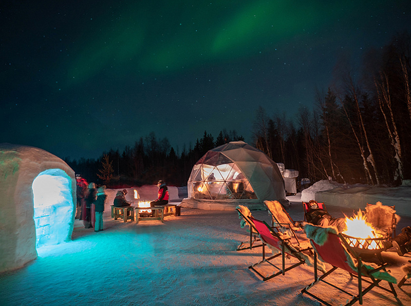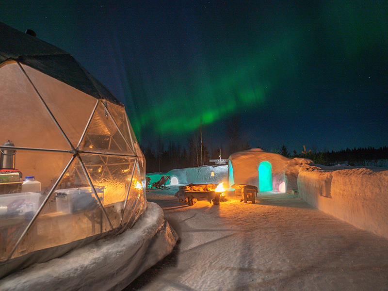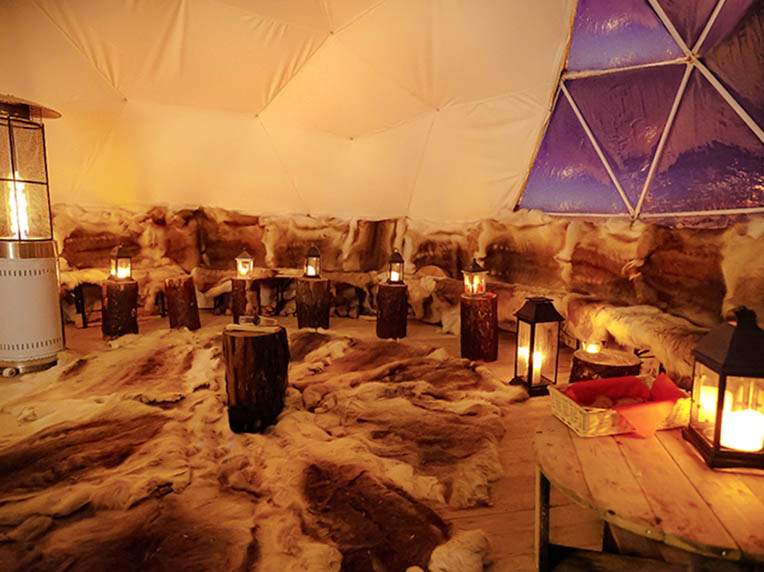 - Aurora dome: 6m warm glamping tent with reindeer skins seating area, fireplace, cozy candle lightning