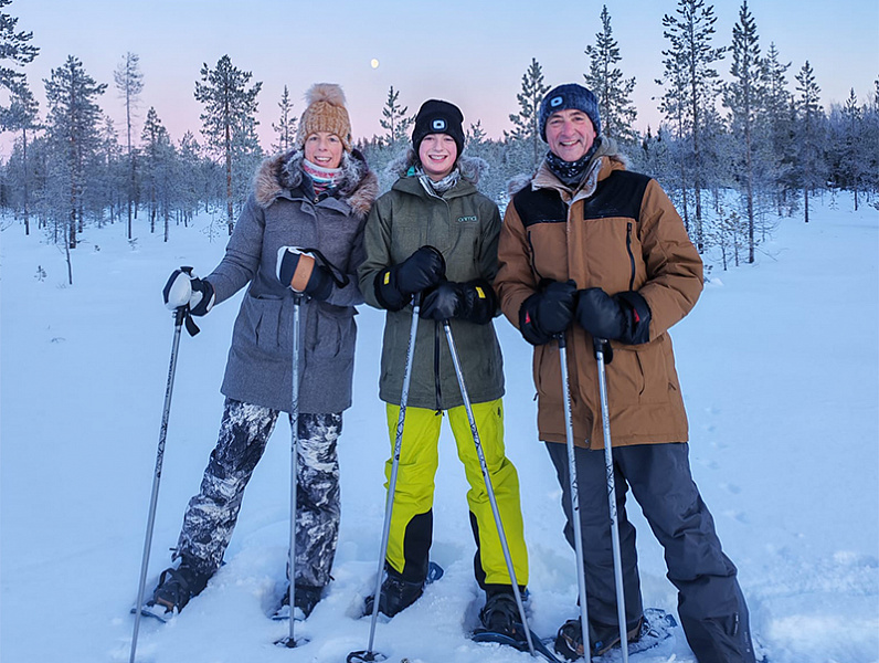 - 2-4 km snowshoe hike through quiet forest and fell terrain, with a viewpoint stop along the way (weather dependent)