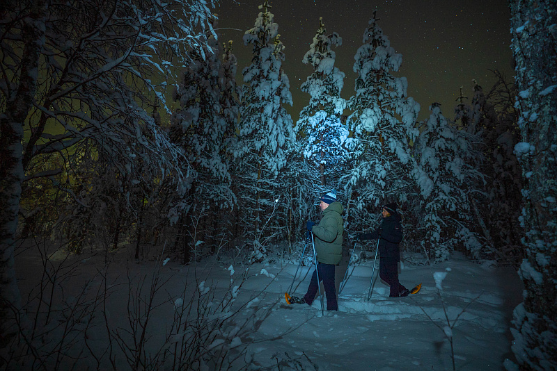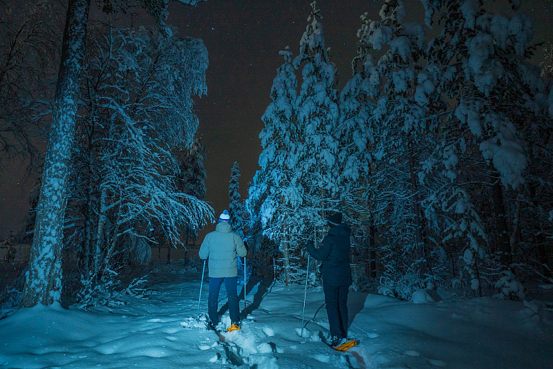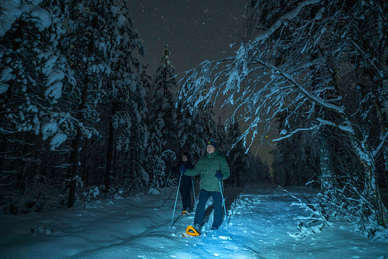 Step into the Arctic night for a peaceful and scenic downhill snowshoeing adventure on Levi Fell. This moderate-level evening tour takes you through snowy forests and open landscapes, offering a unique opportunity to enjoy the tranquil magic of Lapland after dark — whether under a starry sky, softly falling snow, or, if you're lucky, a display of the Northern Lights. The guided hike ends right in the heart of Levi village, next to the main ski slopes