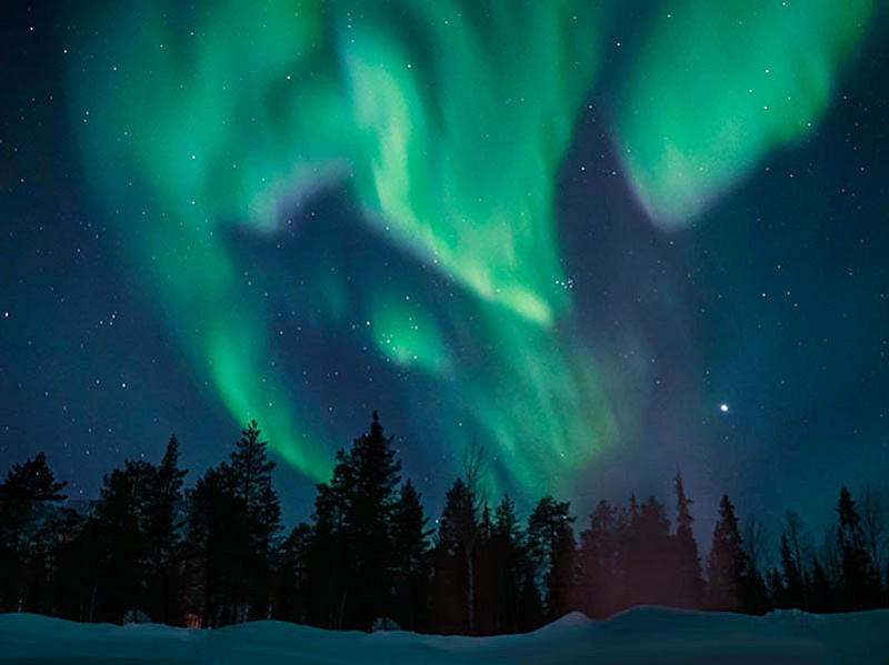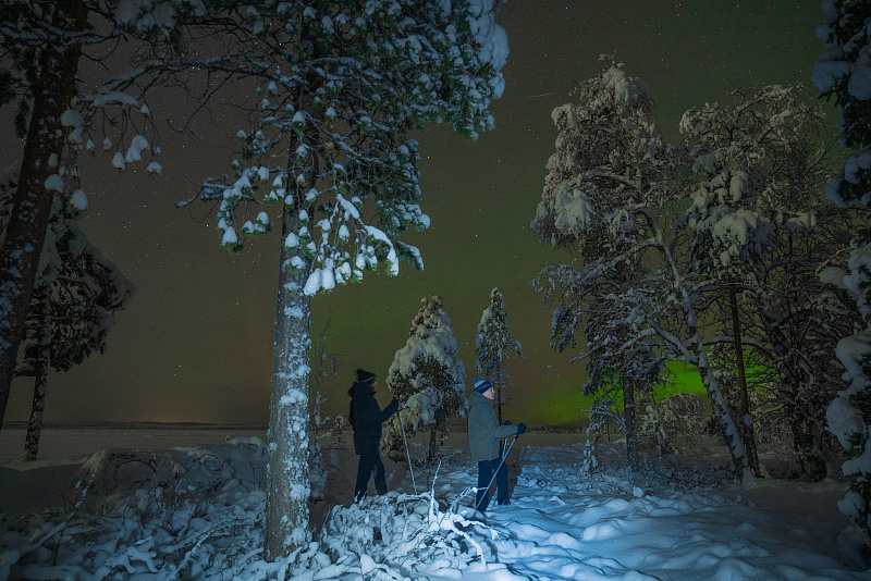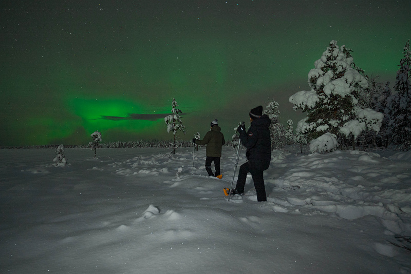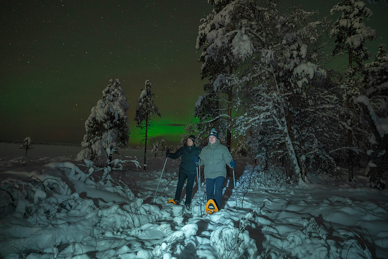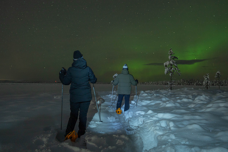 Your evening begins in Levi village, where you’ll meet your local guide and be fitted with snowshoes based on your shoe size (worn over your own sturdy winter boots). After fitting, you’ll take a 5-minute car transfer to a panoramic viewpoint near the summit of Levi Fell — a prime location for panoramic views and night sky observation.