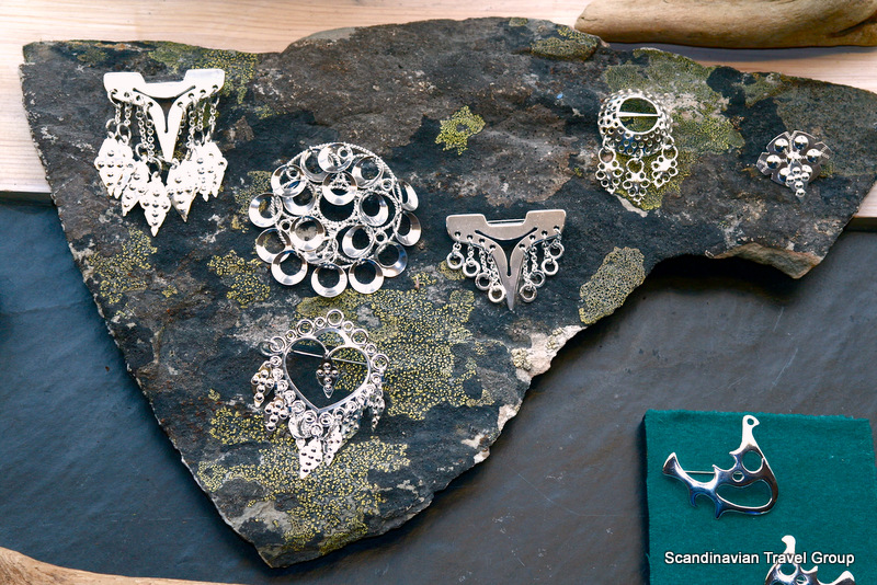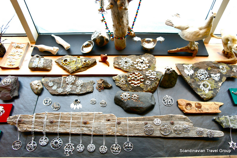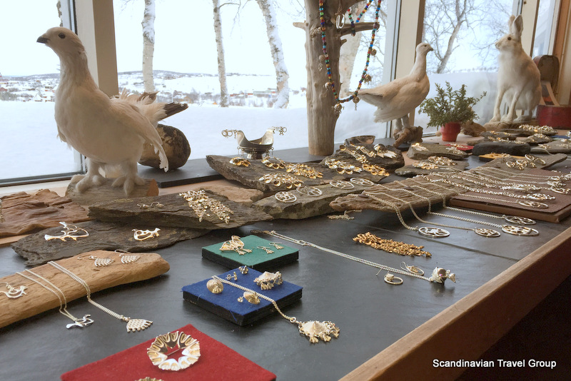 Silver gallery JUHLs is a life's work of Frank and Regine Juhls. It all started in the 1950s when the couple began to take on work repairing Sami silver jewelry, none of which had been made by the Sami; it had found its way north through trade. The silver gallery building is full of surprises, such as the little hen and sheep barn, separated from the exhibition only by a glass wall. One room is devoted to the Juhls couple's travels in Afghanistan where they found a nomad culture that bore many similarities to the Sami culture. A small wing is also a museum for old objects that were discarded in the fifties and sixties, when plastic and steel came into vogue. It contains costumes, cheese-making molds and bone spoons — old items that no one needed any more. The silversmith also works in the building.