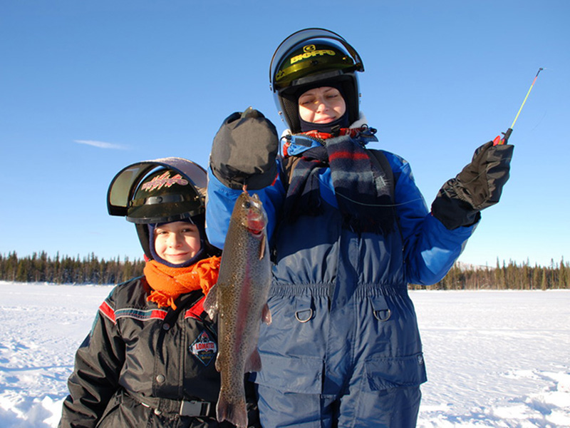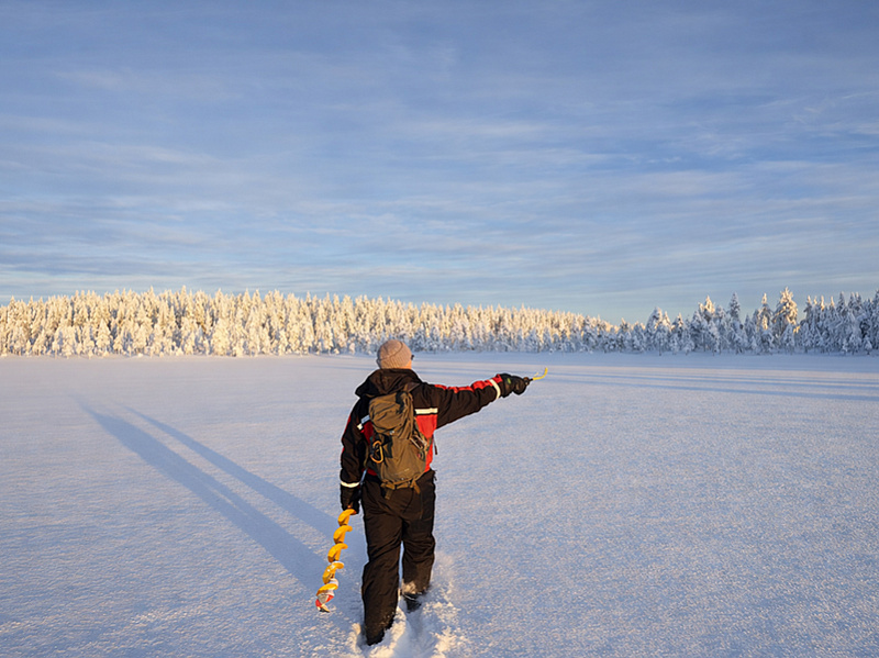 You'll ride your snowmobile along winding forest trails through snowy landscapes, heading toward a peaceful taiga lake tucked deep in the wilderness. There, your local guide will help you drill a fishing hole through the thick ice and provide all the gear and expert tips you need to try your luck at ice fishing, a favorite winter pastime in Lapland. Your guide will serve you a hot drink and a light snack, while you enjoy the quiet beauty of the Arctic wilderness.
