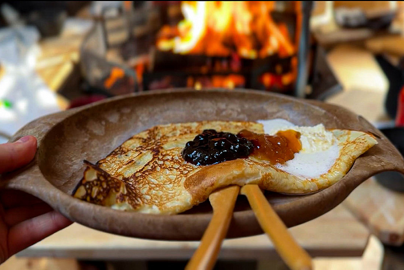 After the main course, enjoy a sweet dessert: thin and crispy pancakes topped with jam made from hand-picked Arctic berries and fresh whipped cream, served with coffee brewed over the open fire in a traditional pot. All ingredients are locally sourced, celebrating the seasonal tastes of Lapland.