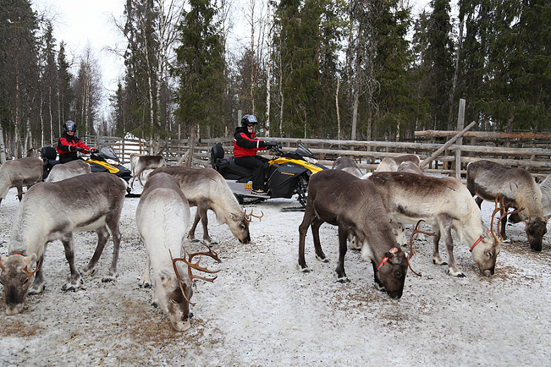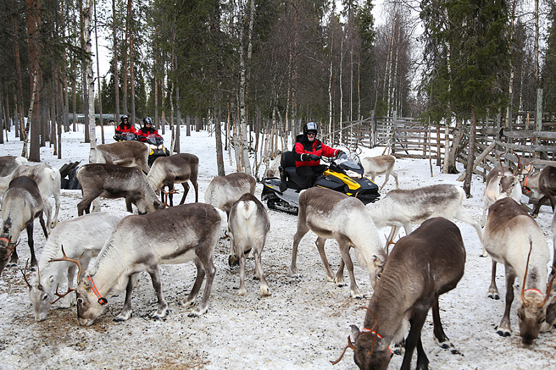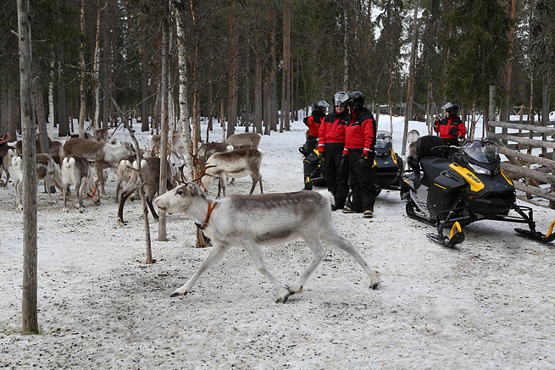 After approximately one hour of scenic snowmobile riding through snowy forests and across open landscapes, you will arrive directly at a traditional reindeer farm. As the snowmobiles come to a stop, you’ll find yourself surrounded by a “sea” of curious reindeer — a moment that feels both magical and authentic.