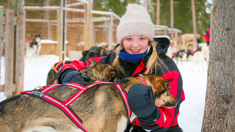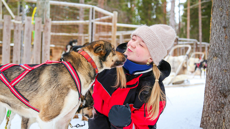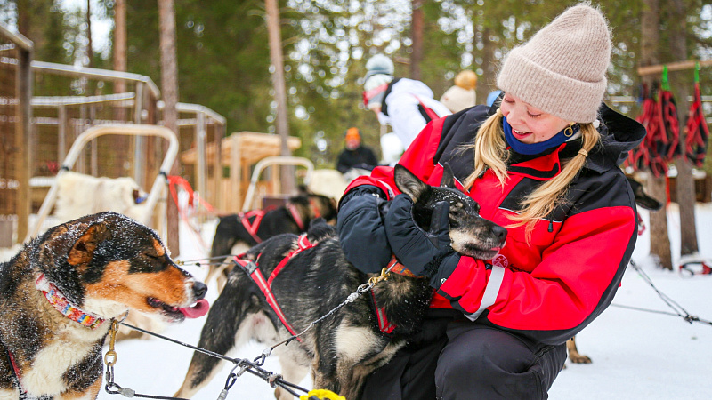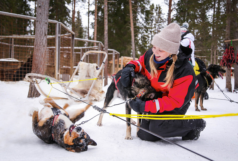 The track lies partly in the forest and partly on a beautiful frozen river. After the ride we have a chance to say thanks to our runners and take photos with them. We will walk around the kennel to meet the other dogs and then cuddle and pet the dogs and take photos with them in a special area of the kennel. Then we invite you inside our cozy hut (kota) to warm up around the open fire, having hot berry juice with cookies. The host will talk about life with the dogs and answer questions.