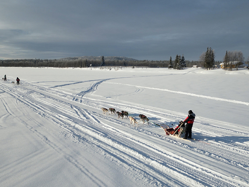 The track length is 10 km and the approximate riding time is 30-40 min. The ride time can vary, as it always includes a stop-over and is dependent on the weather conditions. During the stop-over musher and passenger can swap.