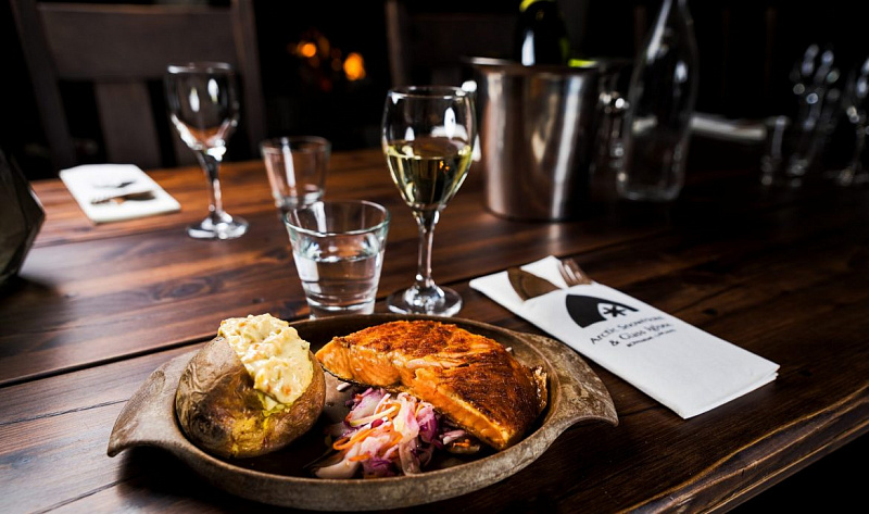 - Salmon glow-fried by the open fire, roasted Lappish potato and leek, dill-tartar sauce and anis pickled cabbage-onion salat