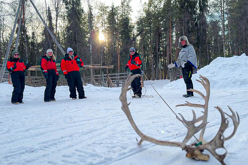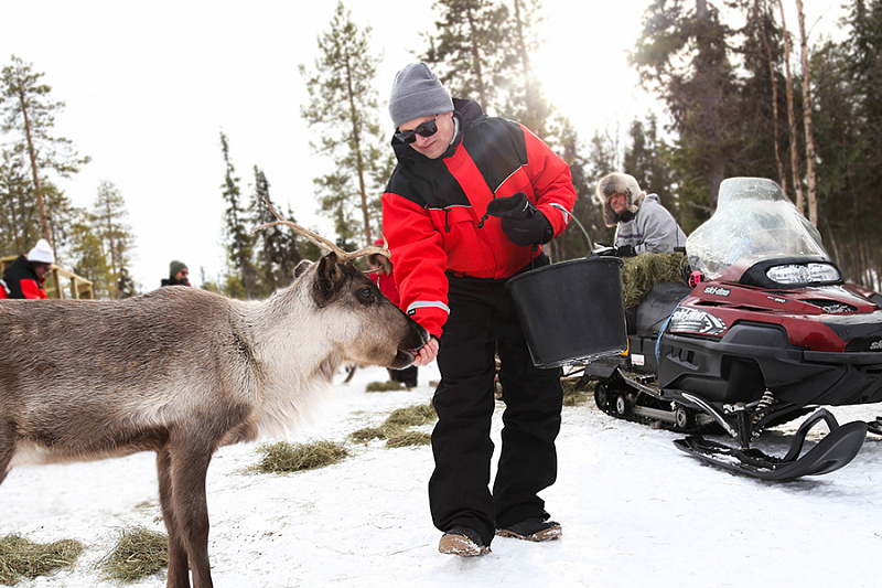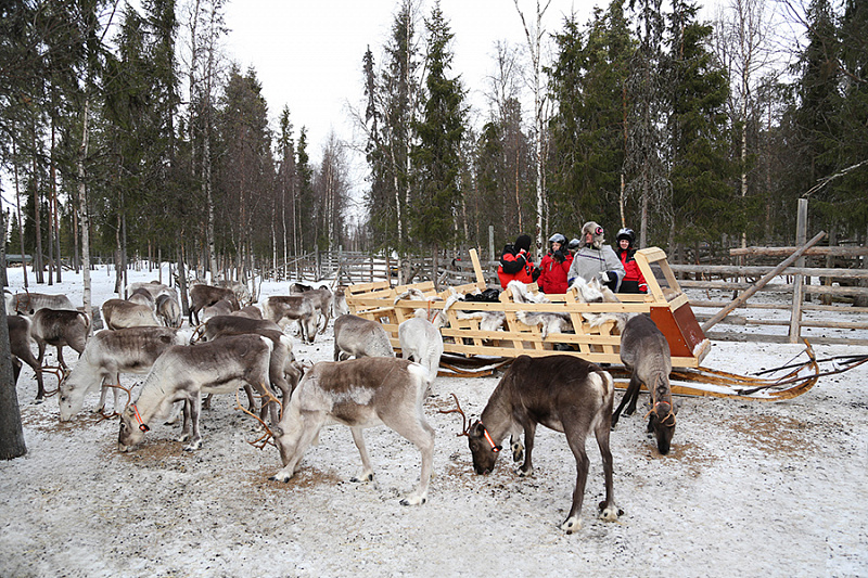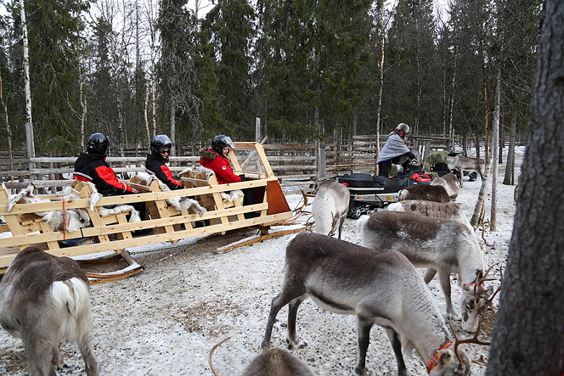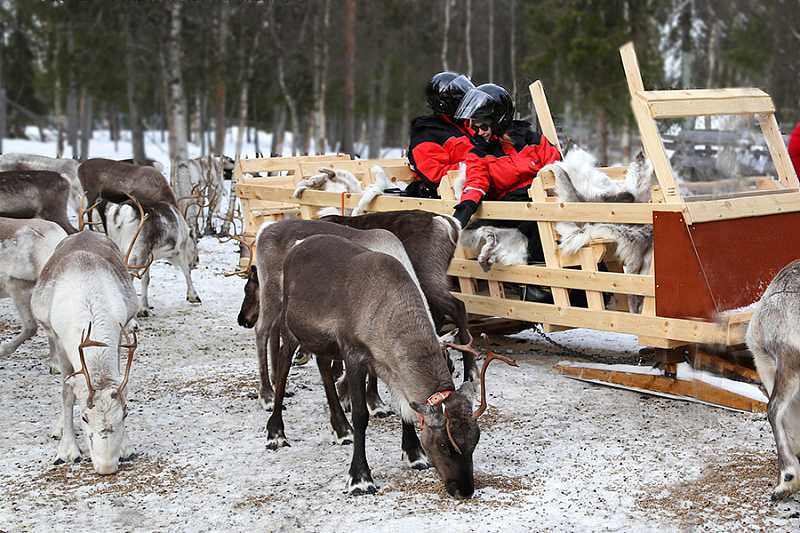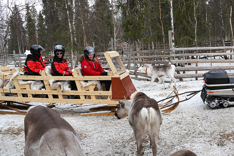 - Ride in a sled pulled by a snowmobile to the reindeer corral