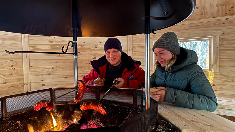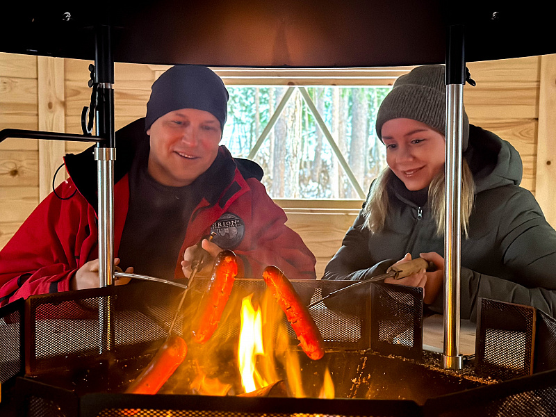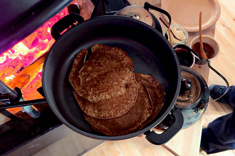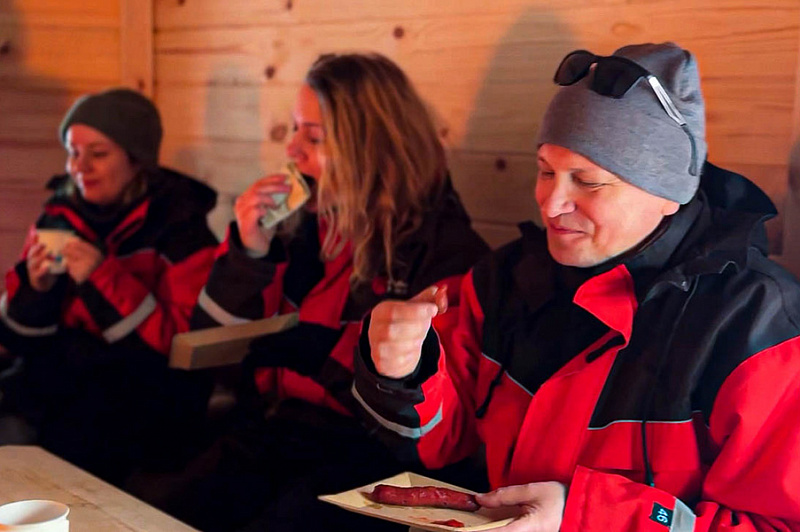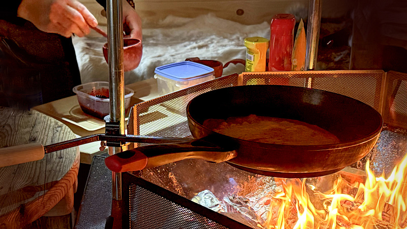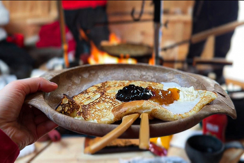 Get comfortable on the benches covered by reindeer skins close to the open fire and we will offer you a warm drink of your choice: herbal tea (naturally decaffeinated) and berry juice. Being outside in the cold naturally increases your appetite, so it’s time to eat locally made reindeer sausage grilled in the open fire. Sausages are made ecologically from the local ingredients and taste like you never had before. After that our chef will serve you thin and crispy pancakes topped with jam from local berries and whipped cream. Pancakes are usually best accompanied by freshly made coffee in a pot on the open fire. In the meantime, our host will continue with storytelling about the reindeer and arctic way of living and of course answer your questions.