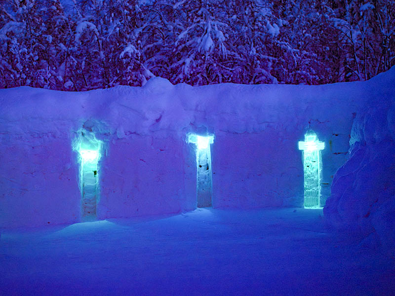 Built each winter by hand as soon as the freezing temperatures hold, the Snow Igloo Park is a world of carved archways, connecting tunnels, igloos and snow sculptures — enclosed by walls of packed snow, and lit after dark in deep blues, purples, reds and ambers. The coloured light thrown across the white snow under an open winter sky is something photographs almost don’t do justice to.