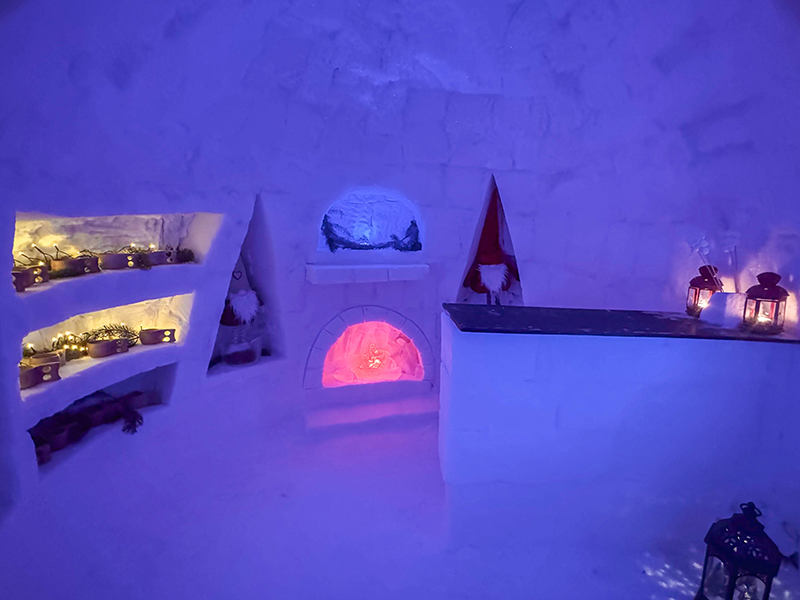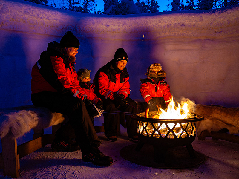 - Outdoor firepit & Lappish BBQ — collect your sausage from the Arctic BBQ Snow Station carved from snow inside the igloo, then grill it over the open fire outside, followed by marshmallows