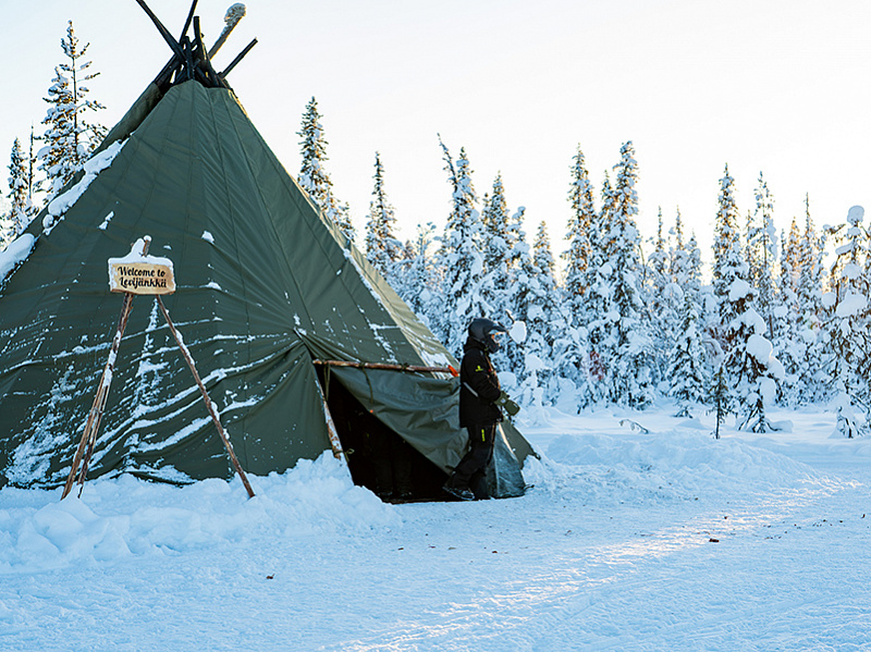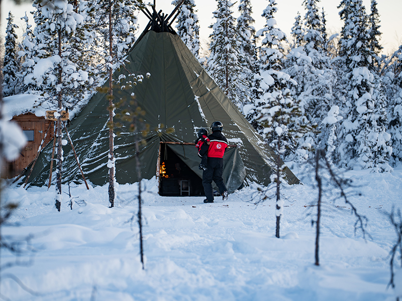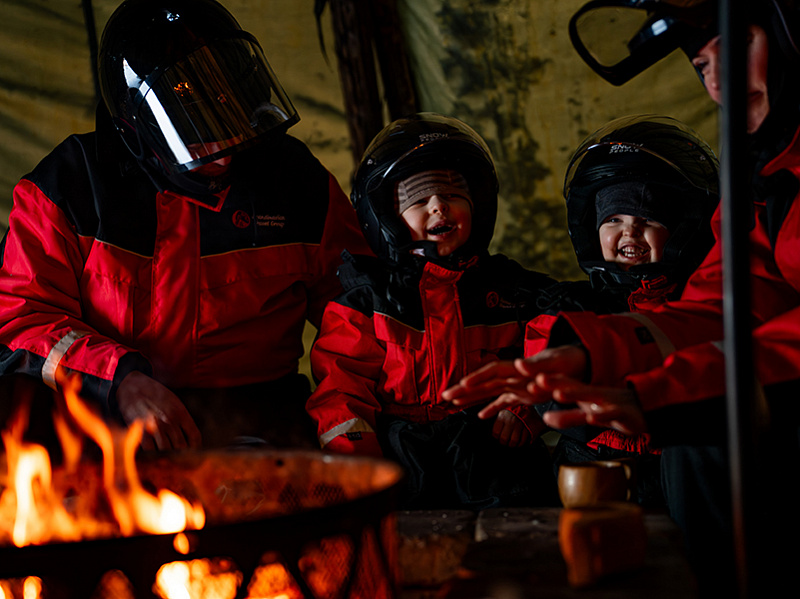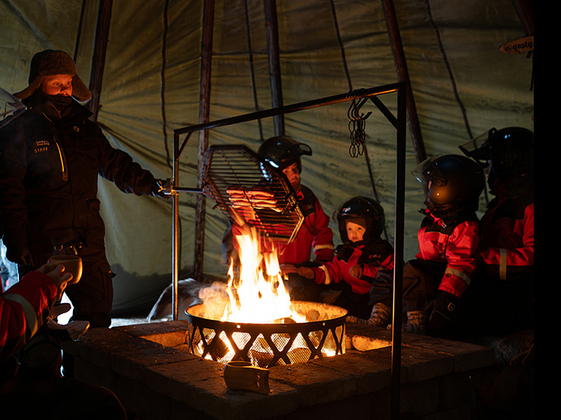 While the children ride, parents warm up inside the kota — prepared and warmed in advance, with a ready open fire — grill sausage and have a hot drink. After the stopover, the group returns together on snowmobiles.