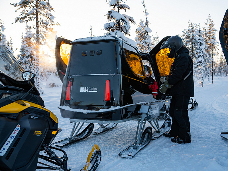 Child age: 3–12 years. Children under 130 cm ride in a sleigh pulled by the guide’s snowmobile. Child price applies only to children riding in the sleigh, regardless of height. Children over 130 cm who can reach the footrests may ride on the snowmobile behind an adult driver — in this case adult price applies. If a child was booked at child price but is tall enough to ride on the snowmobile, the family may choose to upgrade on the day at adult price, or the child may remain in the sleigh at the original child price.