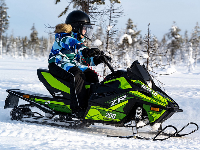 Mini-snowmobiles: Suitable from approximately 3–4 years and 100 cm. Three machines: Arctic Cat ZR120 (age 3+), ZR200 (age 5+), Polaris 550 Indy (age 10+).