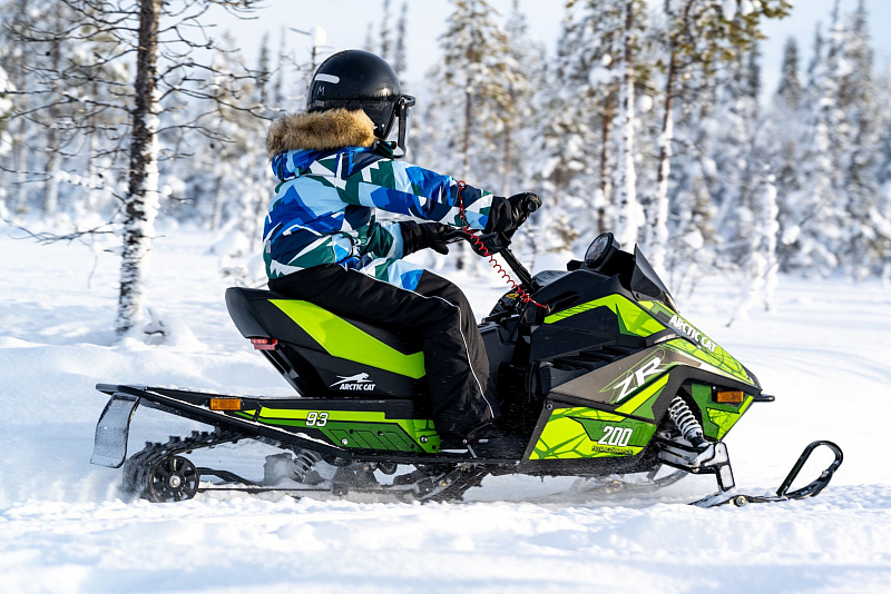 From approximately 3–4 years and 100 cm height. Three machines are available: Arctic Cat ZR120 (age 3+), Arctic Cat ZR200 (age 5+) and Polaris 550 Indy 121 Evo (age 10+). Speed is limited for safety and a guide supervises throughout.